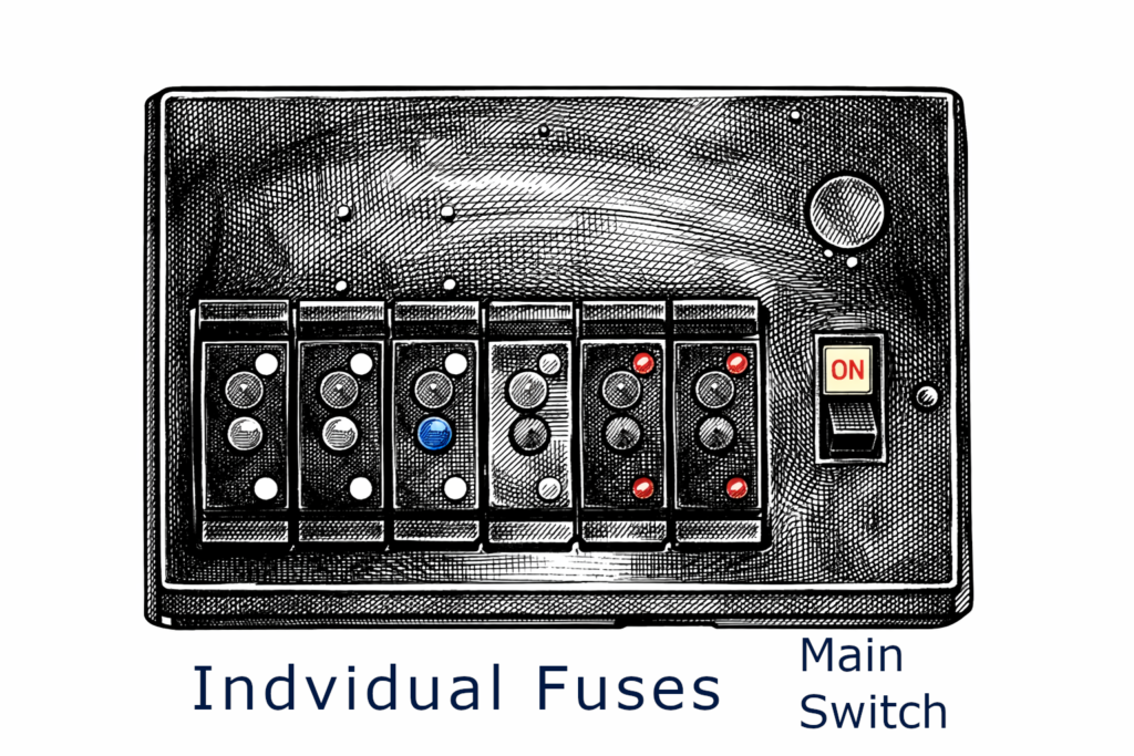 The modern equivalent of the above is the the RCBO board. Instead of having one or two RCDs split across multiple circuits, it will have one Main Switch, and multiple RCBOs. These are both RCDs and circuit breakers. They look much the same as the MCB but will have a “TEST” button. Each RCBO is one circuit.