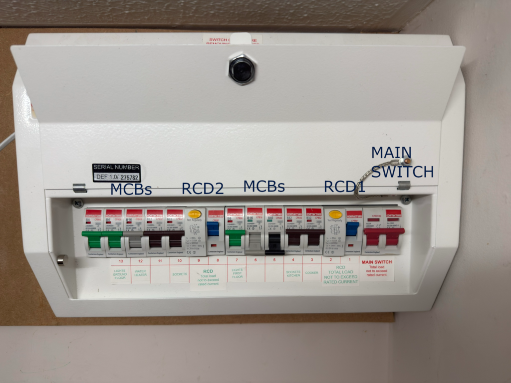 The common modern consumer unit is the Dual RCD or split load board. This often presents with a main switch on the right or left, two further wider devices with “Test Buttons” which are the RCDs and then the individual circuit breakers (MCBs). For these you would only count the individual circuit breakers, not the main switch or the RCDs. Smaller boards may have only one RCD. See picture below for guidance.